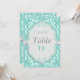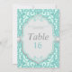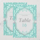 Elegant mintgrön och grå bordnummerkort. Skapat med sjögrön, akvamarin och grå färger i en antikt spetsmönster, är denna design perfekt för eleganta och traditionella bröllop. Ytterligare koordinerade bröllopstillbehör finns tillgängliga på MetroEvents på Zazzle.