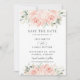 Denna eleganta spara-datum-kort har en pastellrosa ros blommor och mjuka gröna blad bukett. Perfekt för vinter, vår och sommar bröllop. Anpassa det enkelt och snabbt med dina detaljer, tryck bara på knappen anpassa för att ytterligare ändra och formatera stil och placering av texten. (c) The Happy Cat Studio