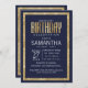 Elegant, stilfull och modern falskt tryckt guldpaillett kant och marinblå bakgrund med falskt tryckt guld folie typografi, Födelsedagsfest inbjudningar. Denna klassiska och sofistikerade design är perfekt för den klassiska, stilfulla och trendiga födelsedags personen. Personifiera med ditt eget meddelande på framsidan och anpassad monogram på baksidan. Alla foto tryck design
