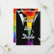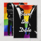 Make your announcement in style with this bold, modern gay wedding save the date card. Two grooms in classic black tuxedos set against a vibrant rainbow Pride flag, with a fully editable announcement message, wedding date, location, and wedding website. Formal invitations to follow.