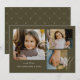 Vi introducerar vår Elegant Modern Joy Collage Photo Holiday Card – ett modernt och chic sätt att fånga julstämningen med en touch av sofistikation. Detta kort har en djupgrön bakgrund som sätter en rik och elegant ton och unik typografi i slående falskt guldfolie, vilket gör det till ett stilrent val för att skicka varma hälsningar. Ordet "JOY" visas elegant i modern och unik falsk guldfolie-typografi, vilket lägger till en touch av glamour och festlighet till designen. Obs: guldfolieeffekten är simulerad i konstverket, och ingen riktig guldfolie läggs till under tryckningen. 3 av dina foton visas i en modern collage-layout, vilket resulterar i ett slående och stilrent julkort som förmedlar dina varmaste hälsningar. Baksidan av julkortet har en koordinerande elegant design, och du kan lägga till ytterligare text och foton genom att använda knappen Redigera med designverktyg när du anpassar kortet. Fira julen med stil och sofistikation genom att skicka vår Elegant Modern Joy Collage Photo Holiday Card. Oavsett om du delar din familjs glädje och kärlek, minns speciella ögonblick eller helt enkelt skickar varma julhälsningar, är detta kort det perfekta valet för att göra din jul verkligt stilren och