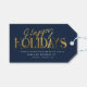 Moderna minimalistiska märkre för affärsgåvor med helgdag med elegant-skript med kalligrafi och läsning av GLAD HELG i tryckt guld. Nedan finns utrymme för ditt anpassningsbar-meddelande och ytterligare utrymme på baksidan över företagets logotyp. Detta är den mörk blått versionen.