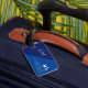 En underbar design för att identifiera dina tillhörigheter. Världens karta, initialer och resenärens namn, två ton blå..