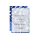 Denna unika, moderna, konstnärliga design har ett mörkt indigo-blått och vitt shibori geodiskt tie-dye-vattenfärgssmönster som liknar agat, marmor eller havsvågor som sköljer upp på en strand. I mitten på framsidan finns alla bröllopsdetaljer i elegant, trendig kalligrafiskrift och sans serif-typografi på ett delvis genomskinligt vitt överlägg som låter det marmorerade mönstret synas igenom. Du kan anpassa den här produkten genom att ändra den anpassningsbara texten i produktmallen.