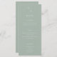 Modern bröllop-meny med minimalistisk typografi i sidled i grönt färg.