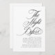 Denna vackra inbjudan till repetitionsmiddag är ett uttryck för tidlös romantik och finstilt elegans. Den roliga, blomstrande kalligrafin som lyder "Nattinnan" anger omedelbart en förtjusande ton, teckning gäster i den glatta förväntningen på bröllopsdagen precis före. Den här utformningen är fet men minimalistisk och ger en häpnadsväckande återgivning av parets oklanderliga smak - en enkel blandning av sofistikering och enkelhet. Det är perfektens sätt att ställa stämningen för ett firande fyllt med kärlek, varma och oförglömliga stunder. Alla färg är helt anpassade till kostym er palett stil och bröllop!