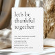 Fira tacksamhet med stil med denna minimalistiska inbjudan till Thanksgiving-middag med det hjärtliga uttrycket ”låt oss vara tacksamma tillsammans”. Med en ren vit bakgrund och elegant typsnittsdesign är denna design både modern och tidlös – perfekt för alla Thanksgiving-firanden.