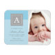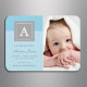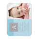 Enkel och sofistikerad fotofödelsemelding magnet visar en djärv serif monogram initial i en platina grå block på en ljus himmelblå bakgrund. En "Introducerar" rubrik med kalligrafi skriptnamn och födelse statistik sitter bredvid ett landskapsfoto. En "Med kärlek" förälder meddelande lägger till en varm avslutande touch. Alla färger och text är helt anpassningsbara.
