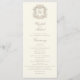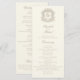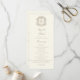This elegant ivory and taupe wedding program features an ornate crest at the top with the monogram initials of the bride and groom in fancy formal script font.