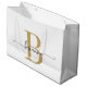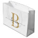 Flickig modern elegant vit och guld monogram initial namn skript anpassningsbar personlig presentpåse. Denna design har ett förnamn i en snygg, handskriven font med svans i kalligrafi (eller typografi) med monogram initial i guld och svart på vit bakgrund. Lätt att anpassa. Denna feminina presentpåse passar bra som husvärmningspresent, även till födelsedag, bröllop, mors dag, sweet 16 födelsedagsfest, baby shower, bröllopsfest, och till examenspresent och den är till flickan som älskar trendiga unika saker.