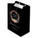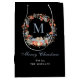 A timeless holiday gift bag featuring an elegant watercolor Christmas wreath in soft dusty blue, red, and peach, delicately framing a personalized monogram in modern typography.