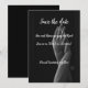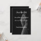 Gör ett djärvt och elegant intryck med detta save-the-date-kort med svart bakgrund och krispig vit text. Den högkontrastiga designen utstrålar sofistikation, perfekt för svarta band-evenemang, moderna firanden eller samtida bröllopsteman. Den minimalistiska stilen säkerställer att dina bröllopsdetaljer är tydliga och fängslande, och sätter scenen för en oföligig händelse. Helt anpassningsbart för att passa din unika vision, är detta kort ett stilfullt och minnesvärt sätt att tillkännage din speciella dag.