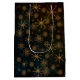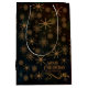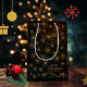 Vacker Personlig God Jul PRESENTPÅSE på svart bakgrund med nyanser av blått och grönt och ett elegant guldliknande mönster med små blommor och stjärnor. Enklare än att slå in. Du kan uppdatera all text, ändra familjenamnet eller använda ett parnamn eller ett företagsnamn. Kan bli en bra företags- eller familjepåse.