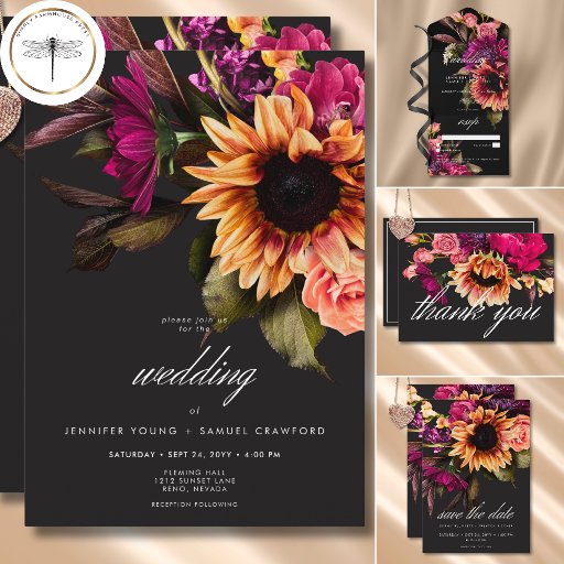 Elegant Moody Vibrant Sunset Blommigt Bröllop Inbjudningar