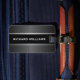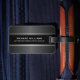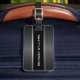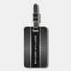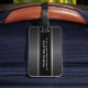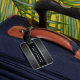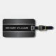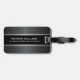 Snyggt bagagetagg med ditt namn i vitt på en svart bakgrund med mörk grått gradient gräns top och grund. Adress på baksidan.