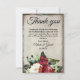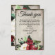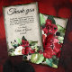 Blommigt med röd och vit mörk arrangemang vid grund på tackkortet. Grått-grumlig bakgrund med elegant-skript och serif-teckensnittskombination för tack. Kortets baksida har en förstorad version av samma arrangemang för blommigt av elegant.