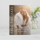 Bröllop sparar datumkort med ditt foto med vit text "Spara datum" i en elegant typsnitt vertikalt till vänster. Ytterligare foto och anpassat meddelande på baksidan.