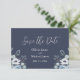 Enkel mörkblå och vit blomster-"Save the Date"-kort. Namnen är skrivna med elegant vit skrivstil. Perfekt för vår-, sommar-, höst- eller vinterbröllop.
