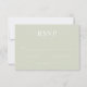 This elegant wedding RSVP card features a minimalist design with a soft, muted green background that exudes serenity and sophistication. The layout is clean and organized, with bold serif typography for the "RSVP" heading and clear sans-serif fonts for response options, creating a modern yet classic look. A simple line divides the header from the response section, which offers two customizable choices for acceptance or decline, along with space to note the number of attendees. The overall mood is calm and inviting, perfect for formal events where clarity and elegance are key.