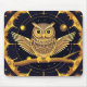 Stiliserad illustration av en nattuggla som sitter på en gren omgiven av guld- och blåmönster, som frammanar en magisk och mystisk stämning, lämplig för dekorativa eller konstnärliga ändamål.