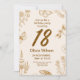 Ett kort för inbjudan till elegant som firar en 18-årsdag. Bakgrunden har en varm beige-ton med dekorativt dekorativt inslag, inklusive blommor, fjärilar och växter som illustreras i bra golden linjer