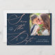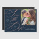 Den romantiska marinen blå och ro guld sparar datumen med modern kalligrafi och foto. "Spara datumet" skrivs över magnet i kalligrafin i elegant ro guld mot en mörk blått bakgrund. Du kan lägga till ett fyrkantigt foto till skriptets höger. Ditt namn, bröllop-datum och bröllop är unikt placerade i typografin.