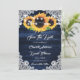 Elegant navy blue and sunflower wedding save the date card featuring sunflowers against a rustic wood background adorned with string lights and delicate floral lace.
