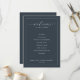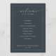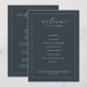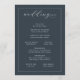 Detta eleganta bröllopsprogram har en djupblå bakgrund med en minimalistisk design som betonar typografi. Layouten är ren och strukturerad och visar ceremonins schema i ett centrerat, lättläst format. En blandning av kursiv och serifferade teckensnitt ger en touch av sofistikering, medan frånvaron av dekorativa element håller fokus på evenemangets detaljer. Perfekt för par som söker en formell men modern estetik, förmedlar detta program en stämning av elegans och förväntan.
