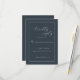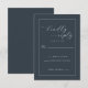 This elegant wedding RSVP card features a deep navy blue background with crisp white text, creating a sophisticated and classic look. The design is centered and vertically aligned, utilizing ample negative space to highlight the cursive script font at the top that reads "kindly reply," adding a touch of refinement. Below, simple serif fonts provide clear instructions for responding by a specified date, while options for acceptance or decline are presented in uppercase letters, maintaining a formal tone. The minimalist aesthetic focuses on typography without additional motifs, making it perfect for couples seeking a polished and straightforward invitation style.