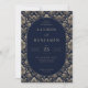 This elegant wedding invitation features a sophisticated design with an oval-shaped central panel set against a richly patterned background. The color palette includes deep navy blue and cream, creating a luxurious atmosphere. Intricate floral motifs frame the panel, enhancing the classic and formal style. The typography is prominent, with customizable placeholders for names, dates, and locations, ensuring personalization while maintaining readability and visual harmony. Perfect for couples seeking a timeless and refined aesthetic for their special day.