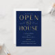 Create stylish business event invites for your house warming or new business party with this faux gold effect Open House Invitation. This elegant navy blue and gold open house event invitation features a trendy layout with sophisticated fonts, space for your logo and event details, perfect to invite guests to your Housewarming Celebration.
