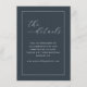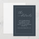 This elegant wedding enclosure card features a deep navy blue background with a clean, minimalist design. The layout includes a white double-lined border framing the content, creating a sophisticated look. At the top, "the details" is written in stylish cursive script, while the body text uses a clear serif font for easy readability. The overall style is refined and professional, perfect for conveying important information about your special day.