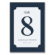 Detta eleganta bröllopsbordskort har en minimalistisk design centrerad kring en stor, fet siffra "8" i djupblått, mot en mjuk, off-white bakgrund. Layouten är ren och sofistikerad, med gott om negativt utrymme som förstärker den moderna estetiken. Ett kursivt typsnitt ger en touch av klassisk elegans till ordet "bord", medan sans-serif-teckensnitt ger tydlig läsbarhet för anpassningsbara textfält. Perfekt för formella tillfällen, förmedlar denna design sofistikering och klarhet, vilket gör den till ett idealiskt val för bröllop eller exklusiva evenemang.