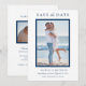 Spara datum! Meddela din bröllopsdag med stil med dessa enkla eleganta vertikala spara datum-kort som visar två av dina favorit-fotografier från förlovningen och text på framsidan och baksidan av kortet som kan anpassas med alla viktiga detaljer. En modern, ren och tidlös design. Det marinblå och vita färgschemat kan anpassas för att passa dina foton eller bröllopsfärger.