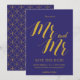 En chic rustik "Spara datum" med "Herr och Herr" med skrivstil i guld på koboltblå bakgrund.
