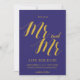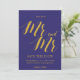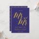 Ett chic rustikt "Spara datum" med "Herr och Herr" med skrivstil i guld på koboltblå bakgrund.