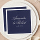 Minimalistiska personliga bröllopsservietter med elegant kalligrafi namn i navyblå och krämfärgad design.