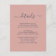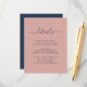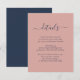 Ge dina gäster viktig information med detta eleganta moderna navyblå och rosafärgade bröllopsinkluderingkort med modernt skrivstil. Matchande artiklar finns tillgängliga. Anpassade förfrågningar välkomnas.