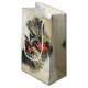 Underbara presentsäcksförpackningar för helgdagarna, ljusa guld-bakgrunden och en spray av exotiska svarta och guld-tropiska löv och handflatan fronder med scarlet rödblommor. Den här utformningen är underbar både för företag och för ge personliga gåvor. Elegant och exotisk Helgdag Tropiskt flytande avfall