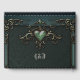 Elegant och romantisk vintage. Den mörk grönt bakgrunden till vintagen är ge som formger en tidlös beröring, medan ram på ett harmoniskt sätt omger hela bilden. Ett stort grönt som framträder med delikata guld-accenter och som är inbäddat i en dekorativ blomning symboliserar parets kärlek och anslutning. Huvudinriktningen ligger på den hjärtligt designade silhuetten av en brud och en grav som förenas i en graciös dans.