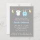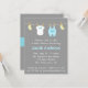 Det är något så sött om små barnkläder och tillbehör! Och det gör det till en underbar och attraktiv design för en underbar babydusch inbjudan. Den här moderna designen omfattar söta baby-artiklar som strumpor i gult baby, en vit baby-byxdräkt med en bockslips och en pastellblå overaller med fickhängning på en klotelin med träpegar. På omvänd sida finns en blå banderoll som lyder "Det är en pojke!". Pastel färg står bara ut med grått-bakgrunden och ge en elegans till den. Anpassa enkelt med dina party-detaljer.