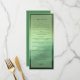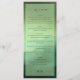 This elegant wedding menu features a clean, vertical layout with ample spacing and a muted olive green background that exudes sophistication. The design uses a mix of serif and script fonts to highlight the different courses—Starters, Salad, Main Course, and Dessert—creating an inviting and refined dining experience. Each section is clearly defined, ensuring easy readability while maintaining a minimalist aesthetic. The soft black text contrasts beautifully against the green backdrop, enhancing the overall elegance. Perfect for high-end events, this menu combines simplicity with a touch of luxury, making it ideal for memorable celebrations.
