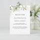 Detta eleganta olivgröna bröllopsmottagning kort är perfekt för ditt moderna sommar boho-bröllop. Det är designat med akvarellsmässiga smaragdgröna och salviafärgade blad, inslag av botaniskt guld och enkel svart vintage typografi. Alla dessa element kombineras för en vacker bohemisk känsla.