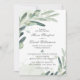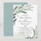 Elegant olivkvist som ramar in din bröllopsinformation i klassisk och skrivmaskinsskrift. Baksidan av inbjudan är en enfärgad dammig blå med ett olivelement.