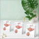 En känslig illustration av blommigten med fyra stora rosa-korallar placerade i ram på ett fyrkantigt plan mot en rent vit bakgrund. Varje peony har många lagrar av ojämnt petalgods med ett gyllene centrum som skapar en fullt, rundad blomning. Blommorna är placerade längst upp och grund i ram, med mindre knoppar och löv av grönt mellan dem. Löven är beskrivet med synliga vener och en sage grönt färg. Bilden har en vattenfärg stil med mjuka, naturliga skuggningar och subtila färg variationer i petalerna. Sammansättningen skapar en symmetrisk utformning av elegant gräns med samma avstånd mellan blommorna. Den totala bilden har en ren, botanisk illustration med stor detaljrikedom i blombladet och löven.
