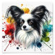 Den här fantastiska vattenfärgsutskriften fångar den känsliga skönheten och livliga karaktären hos en vit- och svart papillon, som illustreras med enastående detaljrikedom och mjuk flytande päls. Den fjärilliknande öron och det uttryckliga ögon stärks av den dynamiska abstrakten stänk i rött, orange, senapsliknande gult, ljusblå och djup grönt, vilket skapar en pulserande och fängslande sammansättning. Perfekt för Papillon älskare, hund entusiaster och de som uppskattar konstnärligt sällskapsdjur porträtt, ger detta högkvalitativa tryck elegans och charm till alla hemmakonstruktioner och kontorsdekorationer.