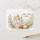 Detta eleganta vykort i akvarell visar en fridfull kyrka med gyllene kupoler, omgiven av mjuka vårblommor och vackert dekorerade påskägg. Den milda pastellpaletten och de handmålade detaljerna skapar en fridfull och andlig atmosfär, perfekt kompletterad av budskapet ”Ha en välsignad påsk!”.