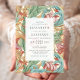 En elegant, lush art nouveau-inspirerad botanisk design i muterade pastellskuggor av grönt, blått, rosa och elfenben ger bakgrunden till grått av kol på ett vitt rektangulärt skärm. Utformningen upprepas på baksidan av kortet.