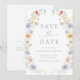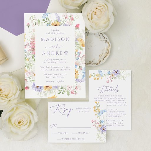 Invite guests to mark their calendars with this elegant pastel wildflower garden save the date featuring delicate watercolor wildflowers arranged along both sides of the design in soft shades of purple, pink, yellow, blue, and white with fresh greenery. The graceful floral border frames the wording in soft lavender lettering, highlighting the couple’s names, wedding date, and location in a clean and timeless layout. Perfect for spring and summer weddings, garden venues, and outdoor ceremonies, this pastel wildflower save the date coordinates beautifully with the matching invitation suite and provides guests with an elegant preview of your upcoming wedding.
