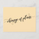 Med det här enkla kortet kan du välja bakgrund färg (om du vill ändra något!) medan du har det här fantastiska teckensnittet. På fronten står det "ändrad planering" med hjälp av ett söt-skript med snurra och vinkara. I baksidan finns platshållare för mallar med information om matchande accent ord med calligraphy-teckensnitt. Använda den här mallen fält för att lägga till dina personuppgifter och ändra mitt förslag till formulering till kostym för dina behov och din situation. 99 //